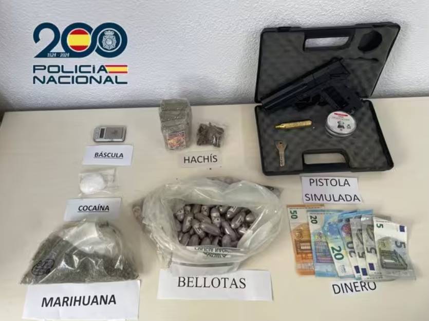 Officers found 300 grammes of hashish, 16 grammes of cocaine, 75 acorns of hashish weighing a total of 770 grammes, 38 grammes of marijuana, a precision scale, an air gun, and other tools used to sell drugs during the searches.