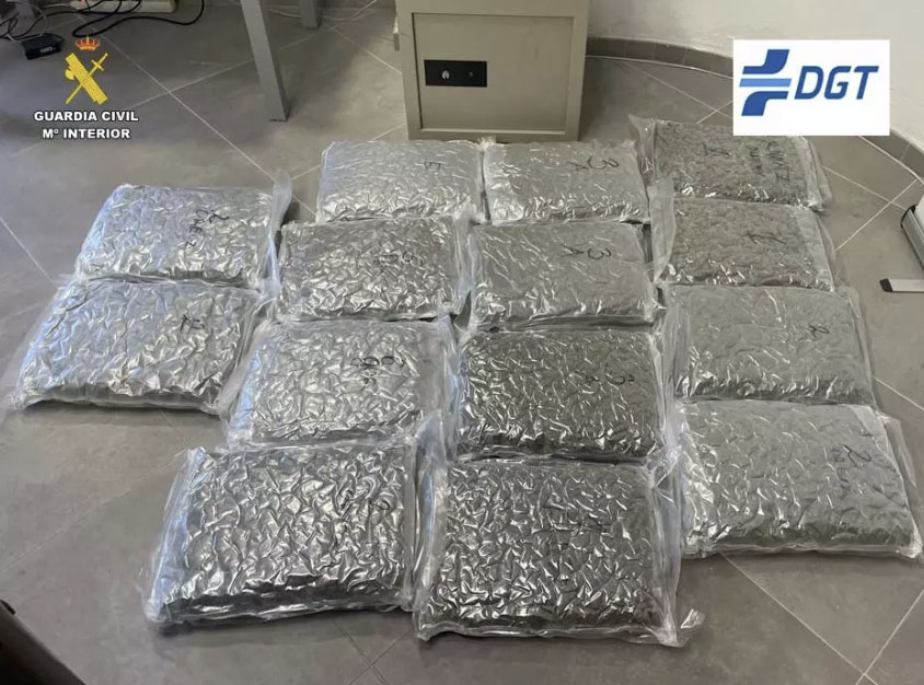 Last September, officers from the Torrevieja Guardia Civil Traffic Detachment , while conducting a speed and road safety operation on the AP-7 near Orihuela, stopped several vehicles. While identifying the driver of one of the vehicles, the officers observed a large box wrapped in clear plastic in the back seat and another box with similar characteristics in the trunk. Given the discovery, the driver’s attitude, and the presence of a bag containing clothing that gave off a strong odour of marijuana, the officers conducted a more thorough search of the vehicle.
